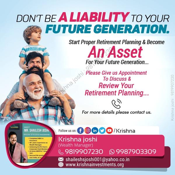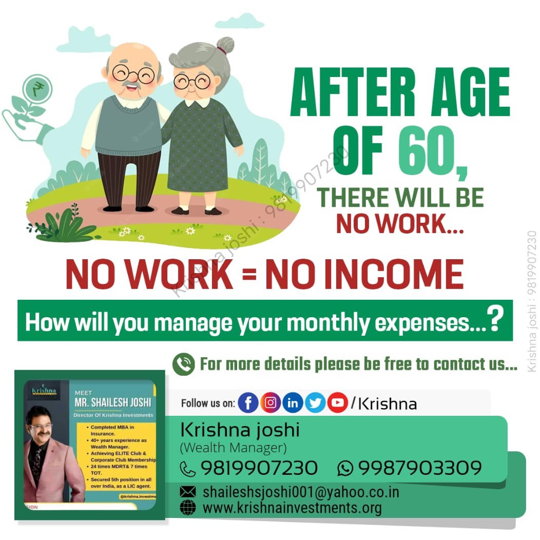 After Retirement .......No Work = No Income π₯Έπ± Do you have any plans ......!! How you will manage your expenses...!? I Can Help You To Plan Your Financial Freedom For Future.....π To Know more about our provided services click on given link... https://mydc.in/?a=9820143309-10 contact me for more information.. https://saathi.licindia.co.in/s/shailesh-joshi/81280925 our financial adviser / best advisor in Mumbai / health insurance / corporate medical Insurance #LICPolicy2025 #insurancelearners #licjeevanumang #LICInvestment #LICScheme #lifeinsurancechallenge #LICPOlicyHolders #lifeinsurancebroker #licadvisor #LifeInsuranceAwarenessMonth #licplanning #licplan #financial Mr. Shailesh Joshi Mobile no : 9820143309 E Mail: krishnainvestments.org freedom #licfdplan #licposters