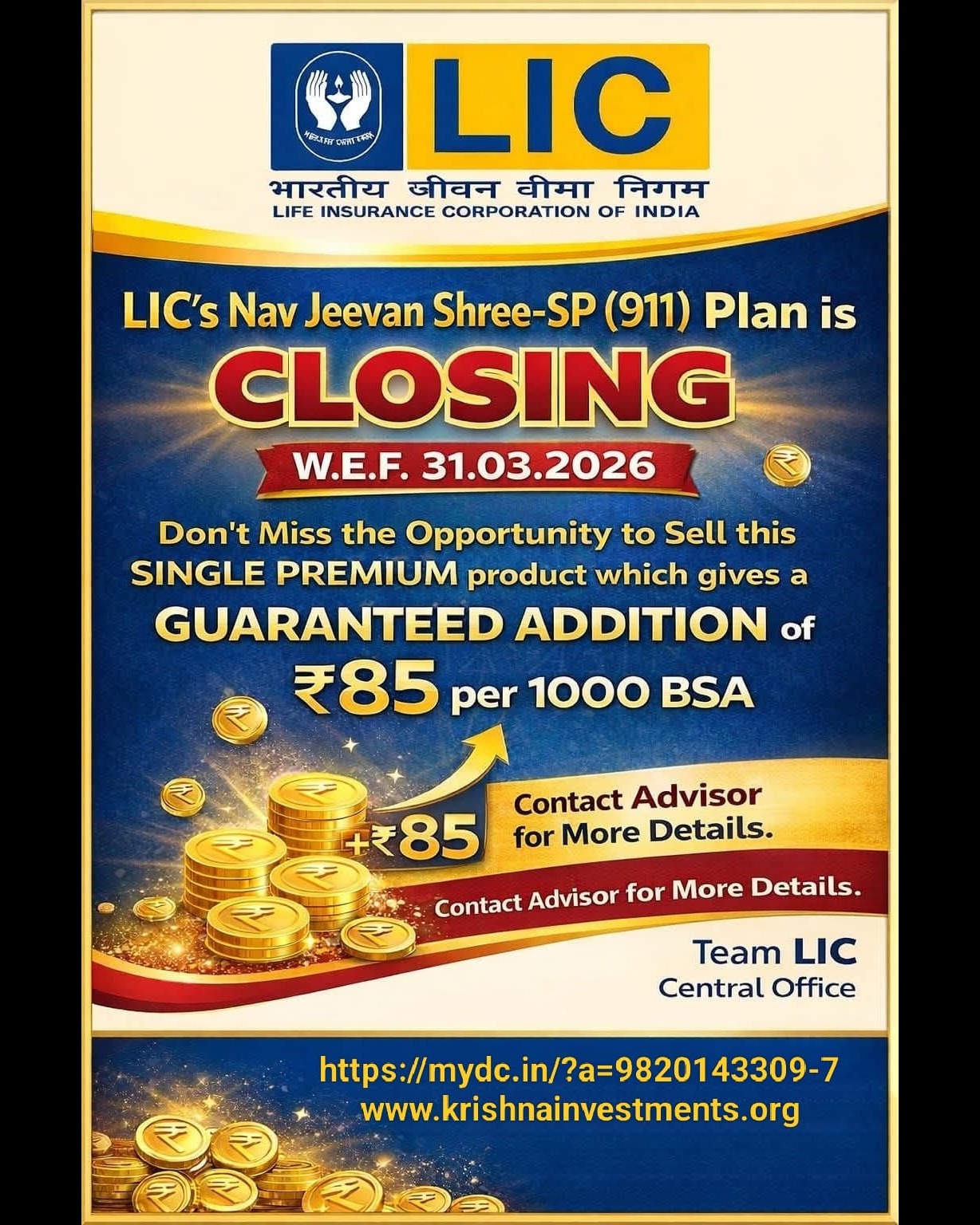 Dont wait for 31st March ......... ❤ Get full bonus .....😍 Do you know buying policy before 31st match can give you full year bonus .....?!!! limited offer Hurry Up ...!!! To Know more about our provided services click on given link... https://mydc.in/?a=9820143309-10 contact me for more information.. https://saathi.licindia.co.in/s/shailesh-joshi/81280925 our financial adviser / best advisor in Mumbai / health insurance / corporate medical Insurance #LICPolicy2025 #insurancelearners #licjeevanumang #LICInvestment #LICScheme #lifeinsurancechallenge #LICPOlicyHolders #lifeinsurancebroker #licadvisor #LifeInsuranceAwarenessMonth #licplanning #licplan #financial Mr. Shailesh Joshi Mobile no : 9820143309 E Mail: krishnainvestments.org freedom #licfdplan #licposters