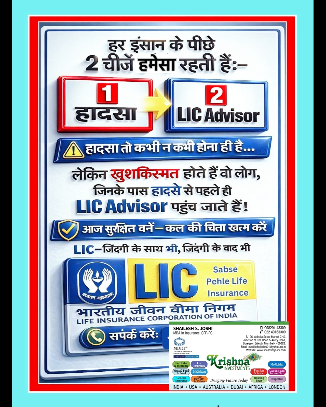 Good morning ☀ ⚠️ हर इंसान के पीछे 2 चीज़ें हमेशा रहती हैं: 1️⃣ हादसा 2️⃣ LIC Advisor ⏳ हादसा तो कभी न कभी होना ही है... 🍀 लेकिन खुशकिस्मत होते हैं वो लोग, जिनके पास हादसे से पहले ही LIC Advisor पहुँच जाते हैं! 🛡️ आज सुरक्षित बनें — कल की चिंता खत्म करें 💼 LIC – ज़िंदगी के साथ भी, ज़िंदगी के बाद भी 🏆 Sabse Pehle Life Insurance #sabsesurakshit #ChildFuturePlanning #vinodtatiwal #smartparents #healthinsurance #financialplanning #FinancialPlanningIndia #LICAgents #insurance #bestfuture