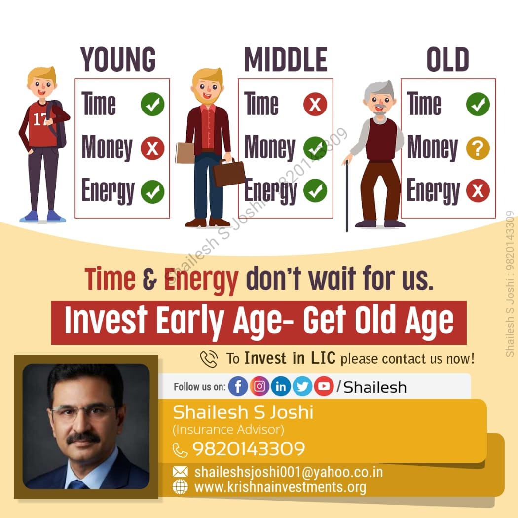 Invest In Early Age ........👉.......Get In Old Age.. Time and age dont wait for us....... Be smart and start saving early.👍🥳 To Know more about our provided services click on given link... https://mydc.in/?a=9820143309-10 contact me for more information.. https://saathi.licindia.co.in/s/shailesh-joshi/81280925 our financial adviser / best advisor in Mumbai / health insurance / corporate medical Insurance #LICPolicy2025 #insurancelearners #licjeevanumang #LICInvestment #LICScheme #lifeinsurancechallenge #LICPOlicyHolders #lifeinsurancebroker #licadvisor #LifeInsuranceAwarenessMonth #licplanning #licplan #financial Mr. Shailesh Joshi Mobile no : 9820143309 E Mail: krishnainvestments.org freedom #licfdplan #licposters
