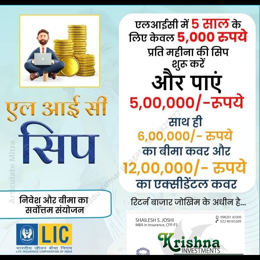 LIC'S SIP😍😍🤩 Invest ₹ 5000 per month only for five years and get # ₹ 5, 00, 000 # Insurance of ₹ 6, 00, 000 # ₹ 12 lakh for Accidental cover.......and much more..👍 To Know more about our provided services click on given link... https://mydc.in/?a=9820143309-10 contact me for more information.. https://saathi.licindia.co.in/s/shailesh-joshi/81280925 our financial adviser / best advisor in Mumbai / health insurance / corporate medical Insurance #LICPolicy2025 #insurancelearners #licjeevanumang #LICInvestment #LICScheme #lifeinsurancechallenge #LICPOlicyHolders #lifeinsurancebroker #licadvisor #LifeInsuranceAwarenessMonth #licplanning #licplan #financial Mr. Shailesh Joshi Mobile no : 9820143309 E Mail: krishnainvestments.org freedom #licfdplan #licposters