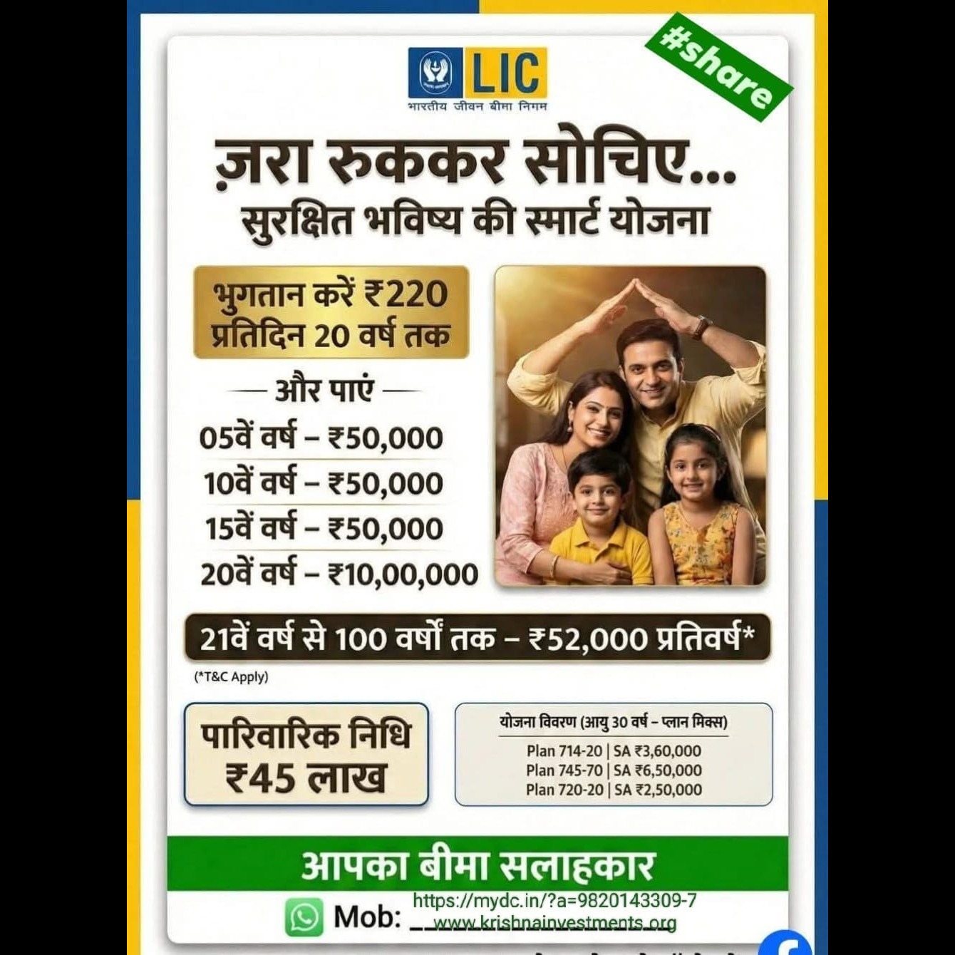 π Stop and Think β Secure Feature With............π€© Smart Plan....ππ By saving just βΉ 220 per day for 20 years you will get .. βΉ 50, 000 at 5th year ... βΉ 50, 000 at 10th year βΉ 50, 000 at 15th year βΉ 10 lakh at 20th and after 21st year till 100 years βΉ 55, 000 every year π β€ To Know more about our provided services click on given link... https://mydc.in/?a=9820143309-10 contact me for more information.. https://saathi.licindia.co.in/s/shailesh-joshi/81280925 our financial adviser / best advisor in Mumbai / health insurance / corporate medical Insurance #LICPolicy2025 #insurancelearners #licjeevanumang #LICInvestment #LICScheme #lifeinsurancechallenge #LICPOlicyHolders #lifeinsurancebroker #licadvisor #LifeInsuranceAwarenessMonth #licplanning #licplan #financial Mr. Shailesh Joshi Mobile no : 9820143309 E Mail: krishnainvestments.org freedom #licfdplan #licposters
