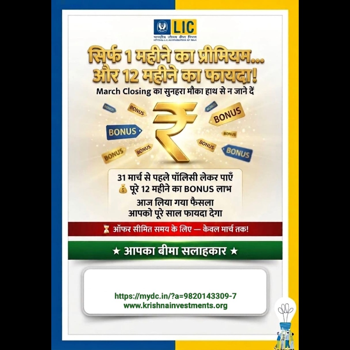 Take Benefit Of March Closeig.....π Only 1 Yr premium...and get 12 months bonus...!!!! To Know more about our provided services click on given link... https://mydc.in/?a=9820143309-10 contact me for more information.. https://saathi.licindia.co.in/s/shailesh-joshi/81280925 our financial adviser / best advisor in Mumbai / health insurance / corporate medical Insurance #LICPolicy2025 #insurancelearners #licjeevanumang #LICInvestment #LICScheme #lifeinsurancechallenge #LICPOlicyHolders #lifeinsurancebroker #licadvisor #LifeInsuranceAwarenessMonth #licplanning #licplan #financial Mr. Shailesh Joshi Mobile no : 9820143309 E Mail: krishnainvestments.org freedom #licfdplan #licposters